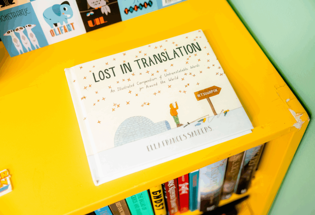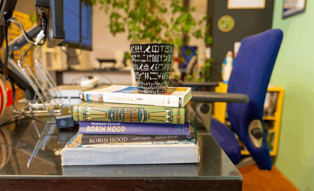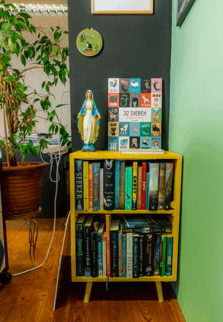 Het boekenkastje heb ik ooit ergens bij het grofvuil opgepikt en geel geschilderd. Het staat vol met titels die ik heb vertaald en geschreven en die daar vrij willekeurig in beland zijn, met erbovenop items waar ik vrolijk van word, zoals het Mariabeeldje (een van vele uit mijn collectie) en een prentenboek van Ingela Arrhenius. De Steen van Rosetta-mok komt uit de souvenirshop van het British Museum en is een beetje een vertalersnerdding: de Steen van Rosetta was cruciaal voor de ontcijfering van hiërogliefen. En er ligt een stapeltje researchboeken – de reisgids heb ik bijvoorbeeld uit de bibliotheek gehaald omdat de hoofdpersonen in een van mijn boeken even in Florence waren. Dan is zo’n reisgids meestal fijner dan eindeloos googelen naar de juiste termen, zeker met de onbetrouwbare AI-resultaten en automatisch vertaalde websites die zoekmachines je tegenwoordig voorschotelen.