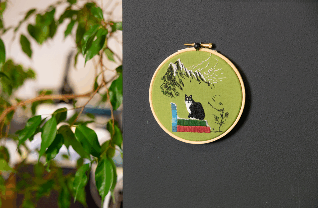 Het borduurwerk heeft een kantoorgenoot een paar jaar geleden voor mij gemaakt als Sinterkerstcadeau. Het is het omslag van mijn bewerking van Frankenstein in combinatie met boeken en mijn (onlangs overleden) kat George, allemaal dingen die me erg dierbaar zijn. Ik word altijd heel blij als ik ernaar kijk. Aan de muur hangen een concertposter van mijn band Le Garage in het voorprogramma van James Leg, een van mijn muzikale helden, en een gesigneerde print uit het heerlijke prentenboek Een huis voor Harry, van de Vlaamse illustrator Leo Timmers.