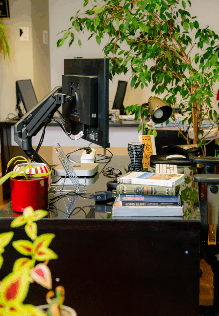 Een koffiezetapparaat. Een noisecancelling koptelefoon voor als ik me echt moet concentreren. En planten. Elke werkplek knapt op van groen, ik kan het iedereen aanraden.