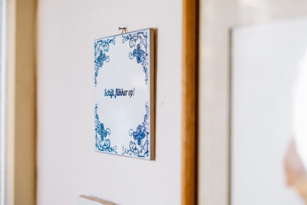 Het tegeltje heb ik van Nicolien Mizee gekregen, toen mijn debuut net af was. Het is een spreuk van Ger Beukenkamp, die een vriendin van haar heeft laten afdrukken. Een aanmoediging om me niet te veel aan te trekken van wat de mensen al dan niet zullen denken.